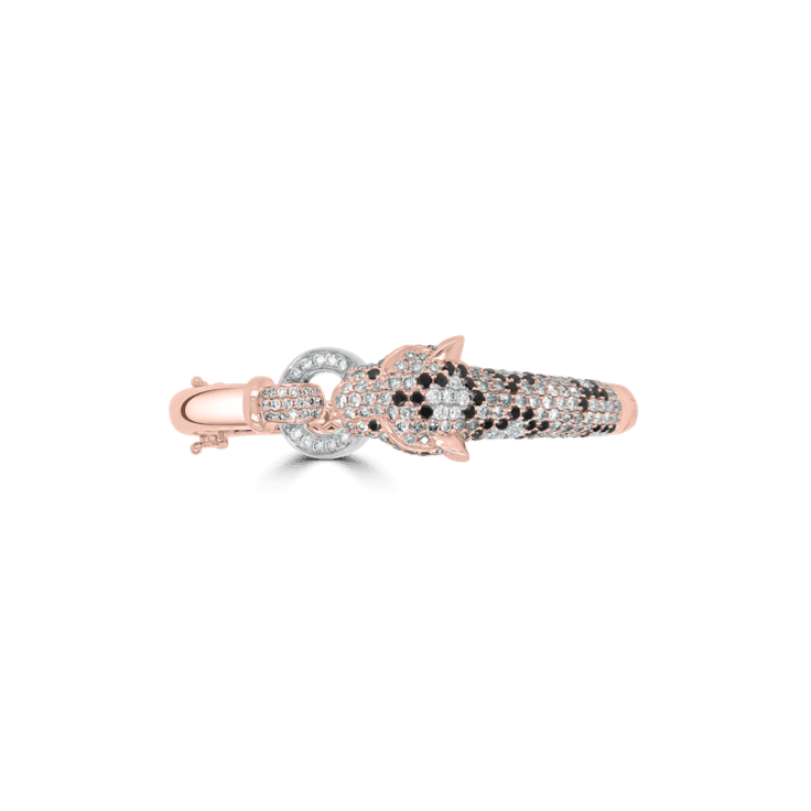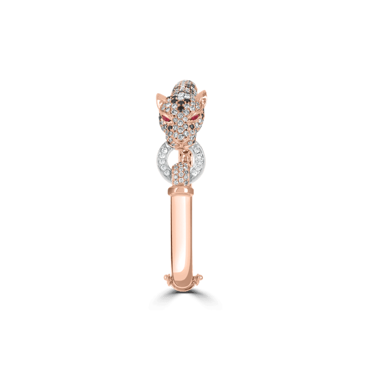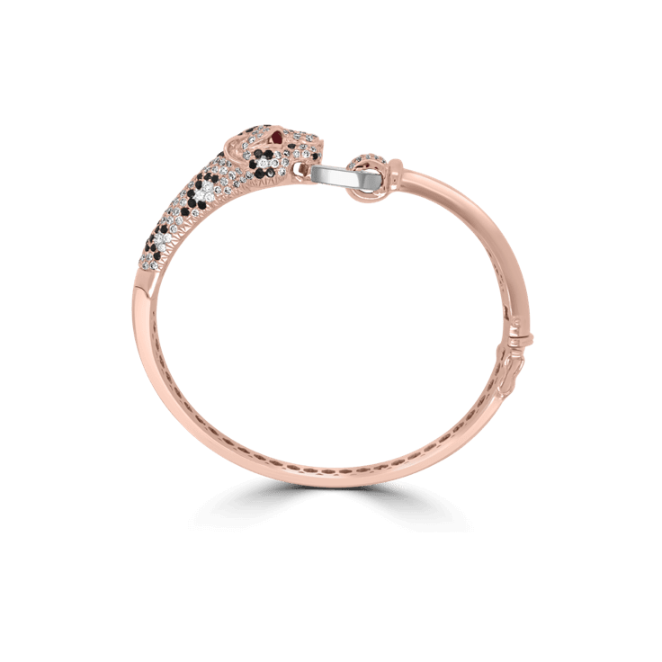 18ct Rose gold leopard head bangle with white gold ring in mouth set with 221 black, white & brown diamonds weighing in total 3.53ct and 2 ruby eyes weighing in total 0.13ct.
