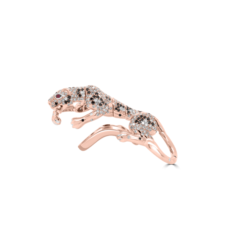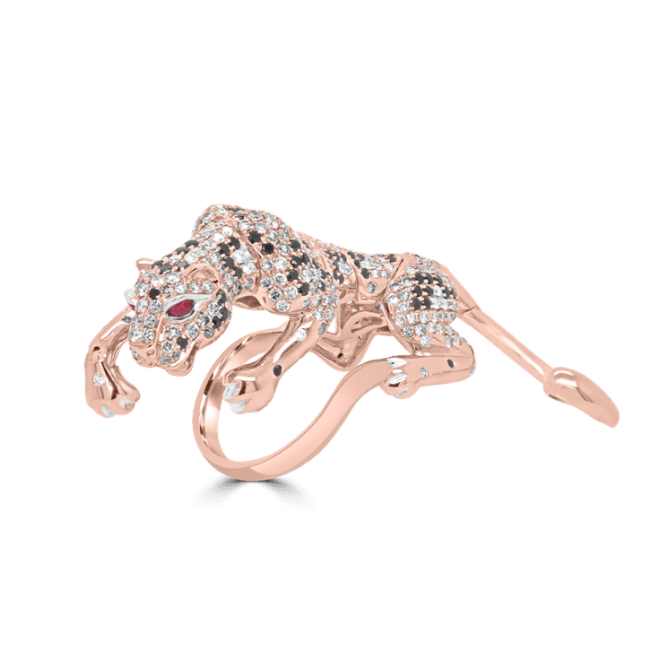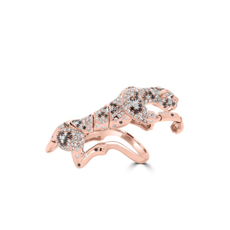 18ct Rose gold sprinting leopard ring set with 439 black, white & cognac diamonds weighing in total 5.42ct and 2 ruby eyes weighing in total 0.03ct.