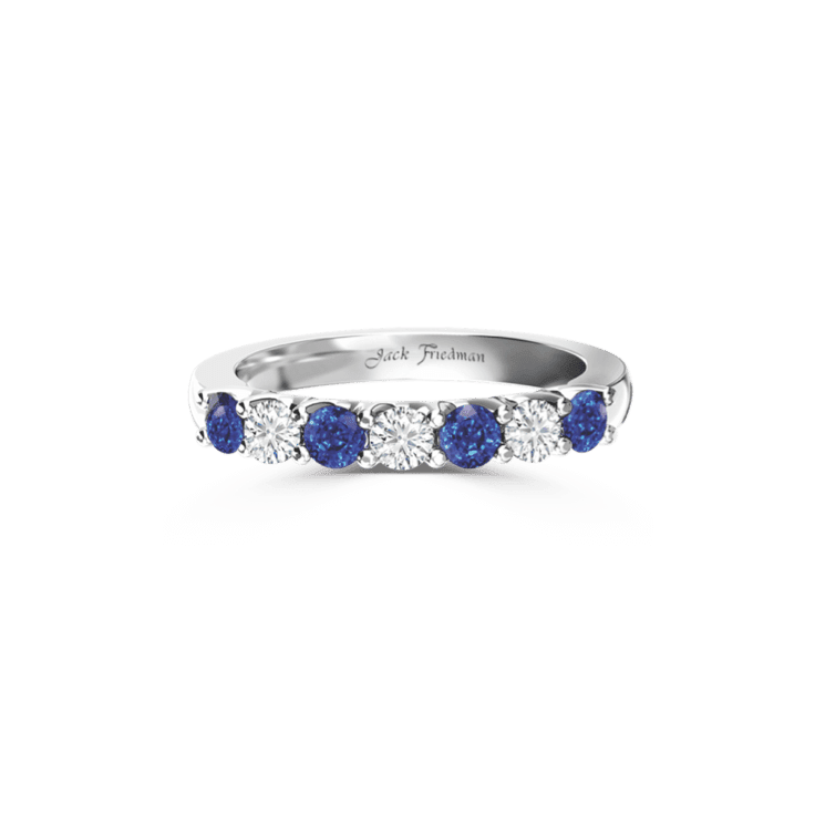 The deep hues of nature combined with the brilliance of diamonds express the true essence of life, love and dreams. The 7 stone La Mer eternity ring is a handcrafted design inspired by the waves of the ocean. This ring features four round sapphires and three round diamonds.