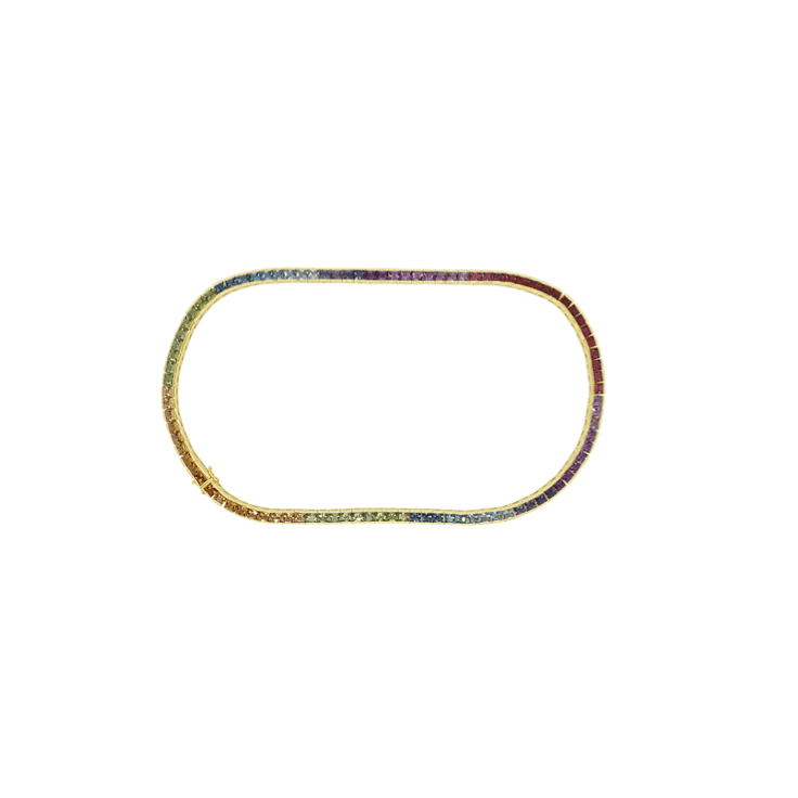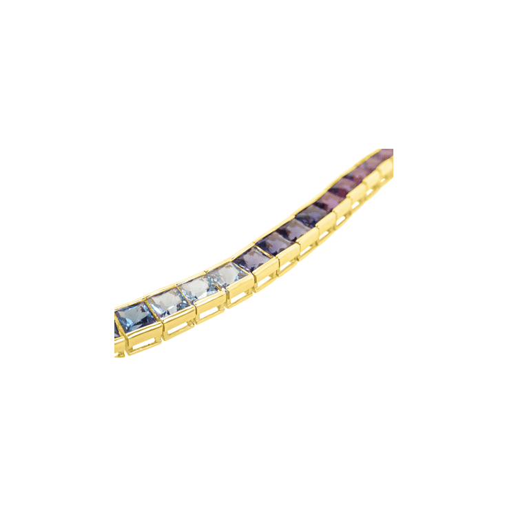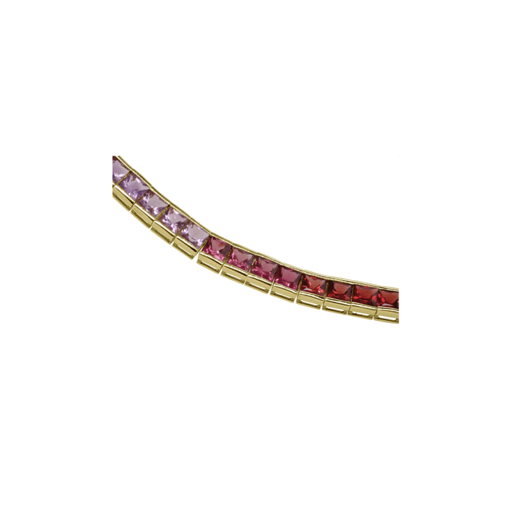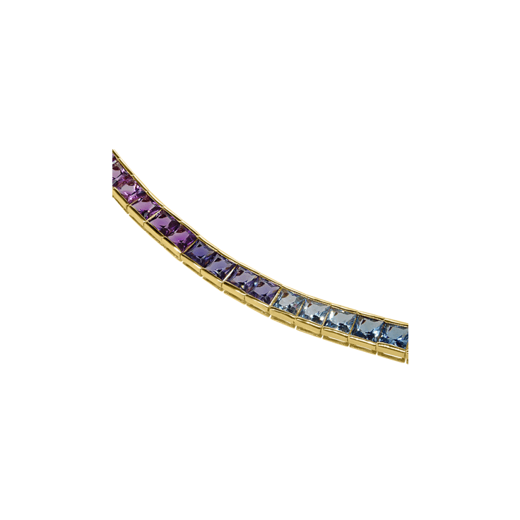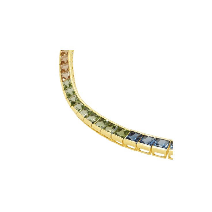 Set in polished gold, the modern choker design sits elegantly on the neckline, making it a true statement piece. The rainbow of gemstones symbolises joy, harmony, and individuality, while their vivid sparkle adds an undeniable touch of luxury.