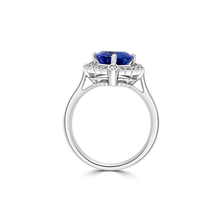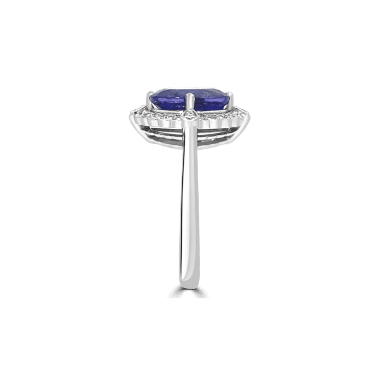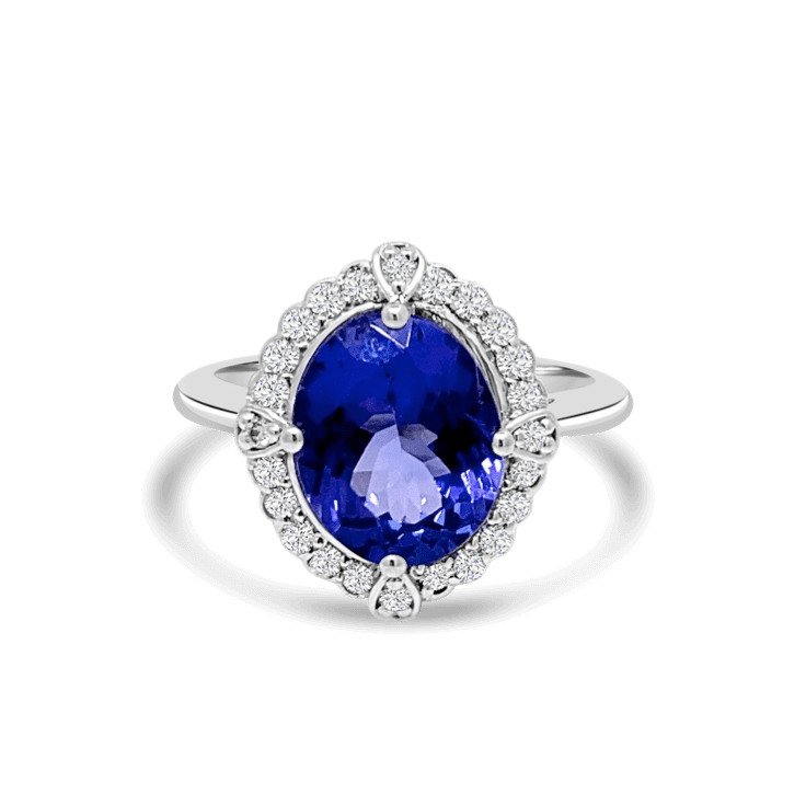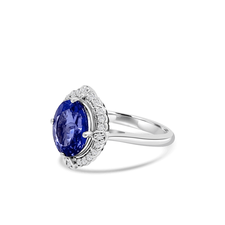 18ct White Gold Oval Tanzanite Diamond Halo Antique Ring set with a 3ct tanzanite stone and 24 diamonds weighing in total 0.27ct