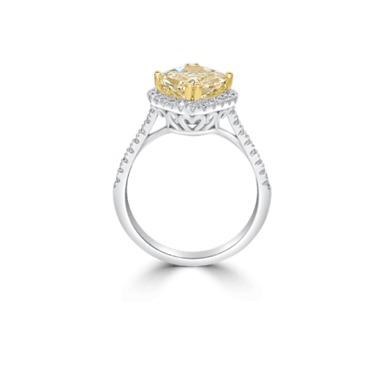 The diamonds surrounding The Intense Fancy Yellow Cushion Diamond Halo Engagement Ringattract the light, forming a glittering halo, drawing attention to the brilliance of the centre diamond and this creates rainbow colours to sparkle in your diamond. Read more about our fancy diamond engagement rings.