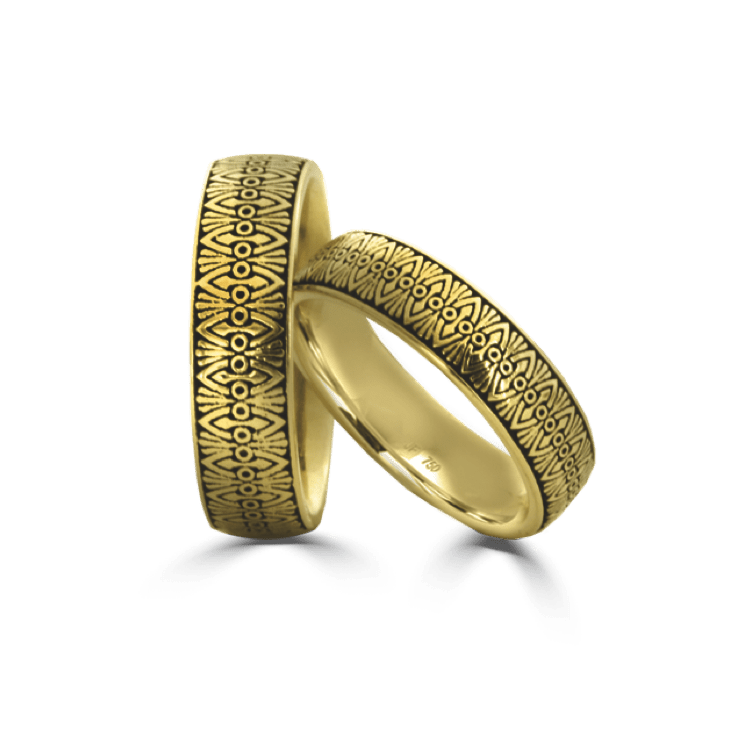 The Grecian Lace Collection with its intricate detailing embrace modernist elements. The 6mm gents wedding ring has a matching 4mm wedding ring for the woman in your life and comes in 18ct Yellow Gold.